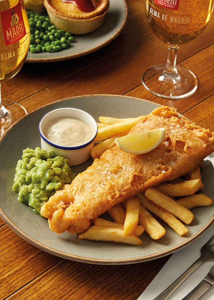 Beer-battered fish & chips, with your choice of garden or mushy peas (†) | 12.29 1095 kcals