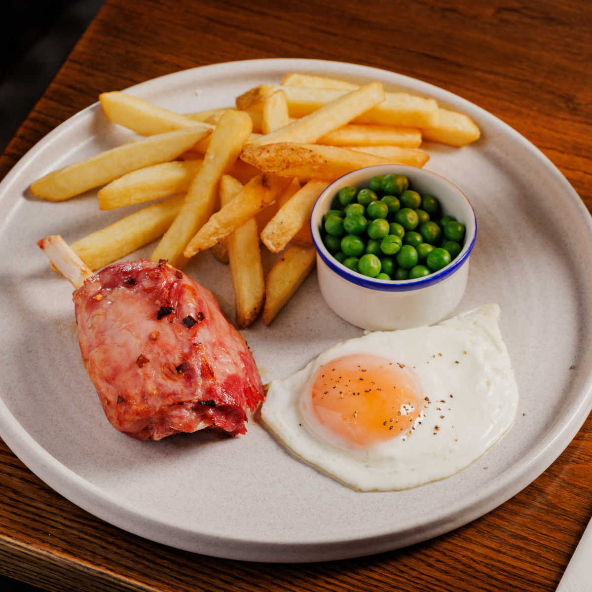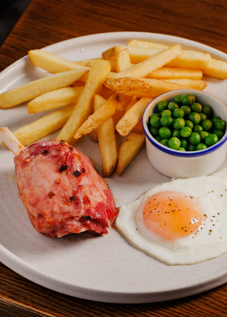 Honey-glazed ham hock, with a free-range fried egg, chips and garden peas | 14.99 1217 kcals