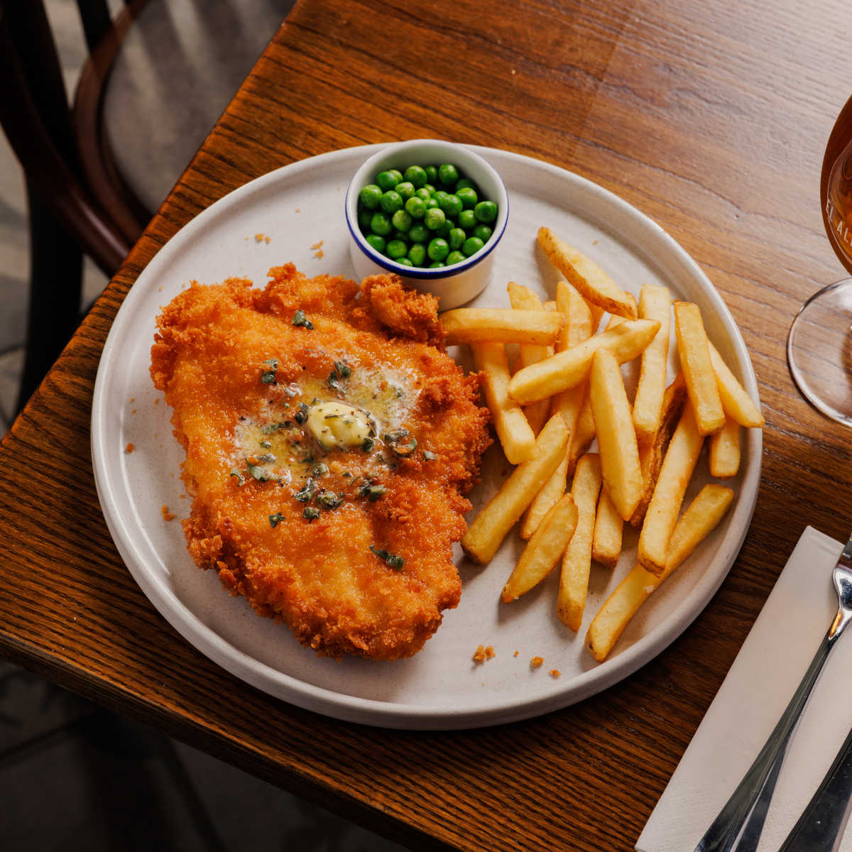 Crispy chicken schnitzel, breaded chicken topped with garlic butter, with chips and garden peas | 12.99 1364 kcals