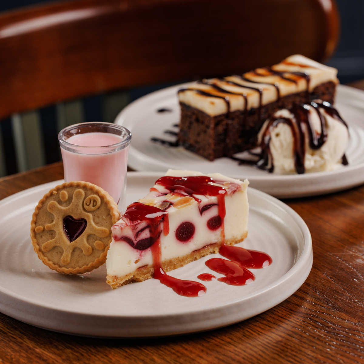 Jammie dodger cheesecake, raspberry & cherry cheesecake topped with almonds, with a boozy raspberry shot on the side (contains alcohol) (v) | 6.49 601 kcals