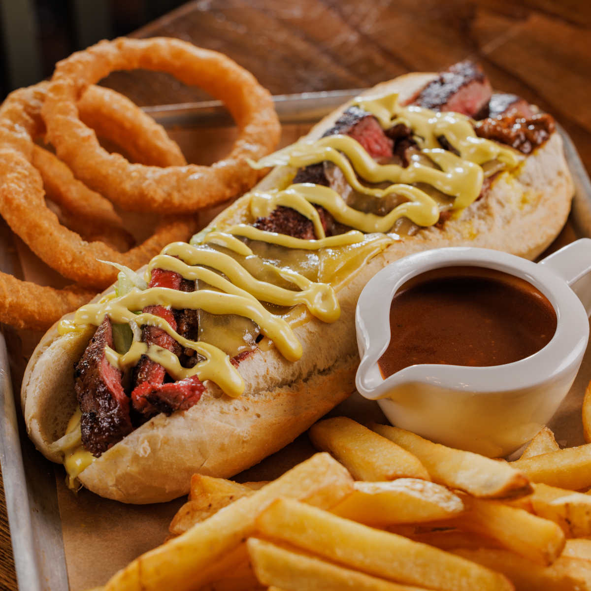 Ultimate steak dipper, steak, melted cheese and rich beef gravy in a crusty baguette, with crispy onion rings, chips and a pot of gravy for dipping | 13.99 1886 kcals
