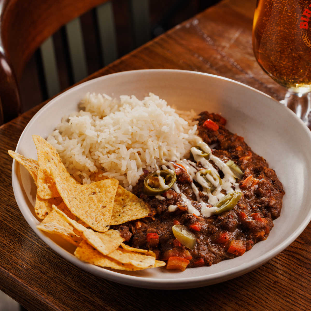 Chilli con carne, with long-grain rice, tortilla chips and jalapeños | 7.99 441 kcals