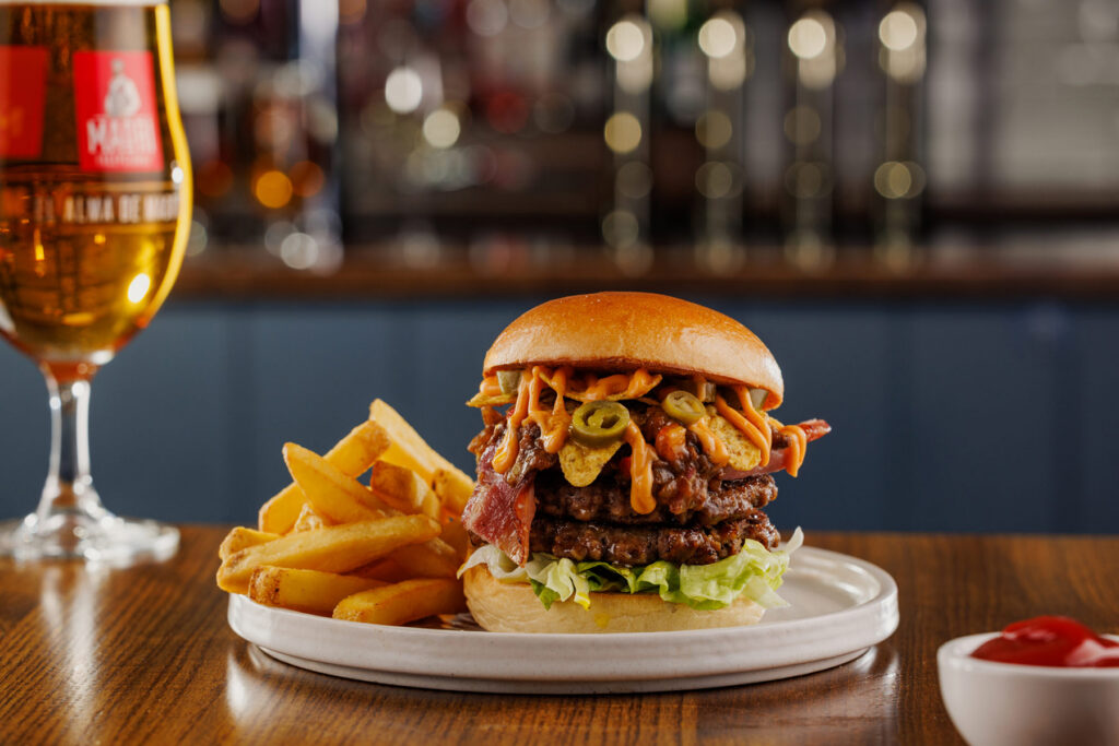Classic burger, two 3oz beef patties with burger sauce. Served in a toasted brioche-style bun with chips | 11.49 1378 kcals