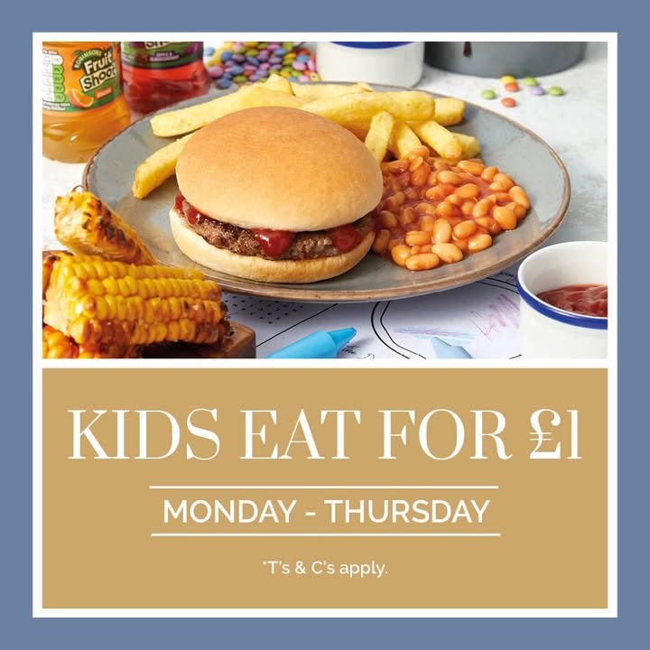 Between Monday & Thursday, you can order a child’s main meal for just £1 when purchased alongside any adult main meal!